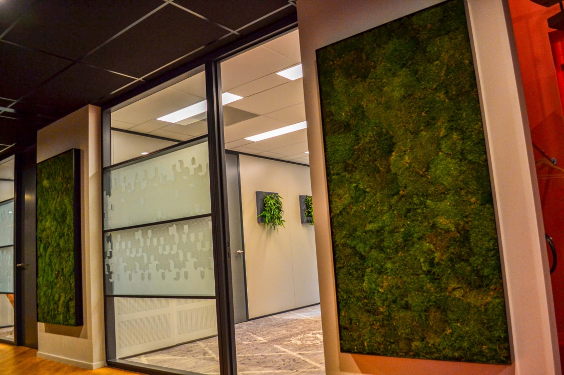 In de gang zijn er op maat gemaakte mos schilderijen geplaatst om geluiddemping én een natuurlijke uitstraling te realiseren. Hierbij is er gekozen voor gemummificeerd platmos. Echt mos, waarin het vocht is vervangen door een duurzame en milieuvriendelijke stof. Het mos blijft lang mooi en heeft het geen onderhoud nodig. Daarnaast zijn er in meerdere kantoren en open plekken LivePicture’s aan de muur geplaatst.