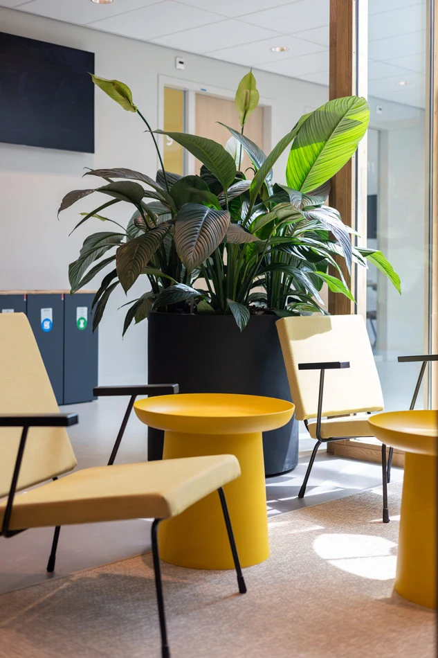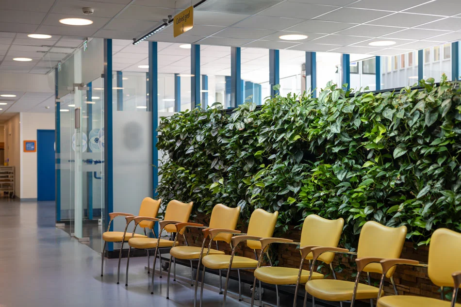 Samen met het UMCG hebben wij diverse groenprojecten gerealiseerd, waaronder indrukwekkende moswanden, plantenwanden en strategisch geplaatste grote Strelitzia’s. Deze groene elementen zijn zorgvuldig gekozen om niet alleen aantrekkelijk te zijn, maar ook functioneel. De grote planten zorgen voor natuurlijke afscheidingen en creëren zitruimtes binnen de grote, open hallen van het ziekenhuis.